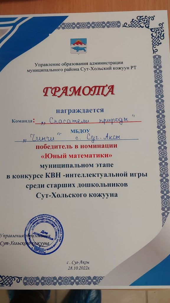 По плану Управления образования Сут-Хольского кожууна был проведен интеллектуальная игра — КВН среди старших дошкольников Сут-Хольского муниципального района. Всего участвовали 7 команд.