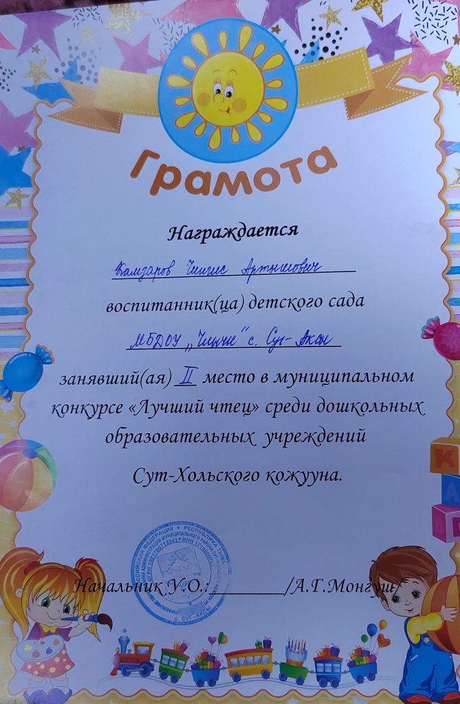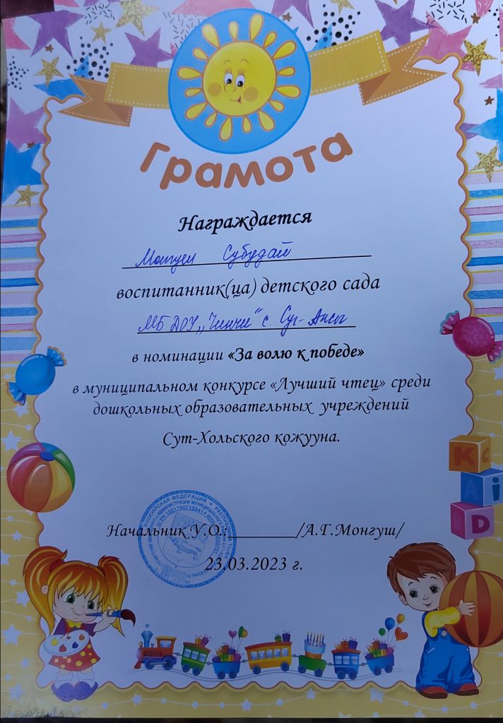 По плану Управление образования Сут-Хольского района был проведён конкурс «Лучший чтец» среди воспитанников ДОУ кожууна. Из нашего детского сада участвовали Монгуш Субудай (6л) с стихотворением Сарыг-оола Салчака «Ынак Тывам» и Камзаров Чингис с стихотворением Валентины Артаа «Кырган-ачам сылдызы»